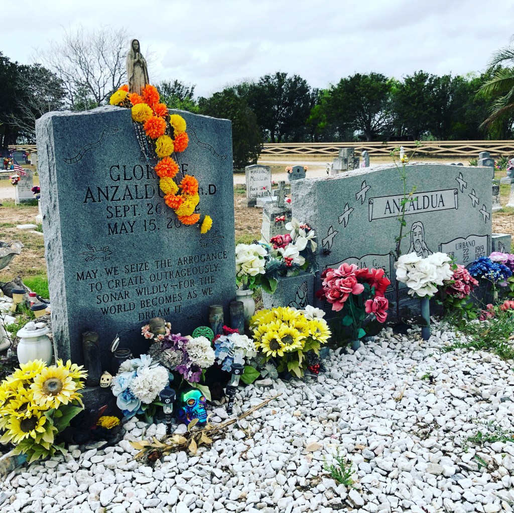 The parched cemetery plots are policed by a bounding black Great Dane, who wanders ghostlike among the remains of Cantús, Dávilas, Domínguezes, Garcías, and Treviños, the stone markers demonstrating a studied inattention to diacritical marks. Typographical errors in Spanish appear on the slightly larger reptilian-decorated headstone of Gloria Anzaldúa. She hailed from and wrote about these Texas borderlands, which I visited for the first time in March (see 9 March 2020). Her words have penetrated my being; thus, this oasis, at the corner of two eroding gravel roads, rife with plastic flowers, American flags, and the detritus of Días de los Muertos gone by, cradles and nurtures seeds of understanding and new life. As in Anzaldúa’s poem “En mi corazón se incuba”: