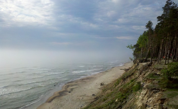 Unknown to me beforehand, the Baltic Sea emits an orb, a welcoming glow that gets diffused through mist and, here on a Lithuanian shore, through thick stands of stately European red pines. I approached on bicycle in May 2013, having pedaled north some five miles from Klaipėda. The bike rattled along a boardwalk for the final 100 yards as the orb grew more encompassing and seemed to take me within its salvific embrace. The Baltic “educational” seaside path runs along a cliff’s edge, where one can sit on sandy loam to meditate, in the late spring and summer, until 10 or 11 p.m. Biking this loop from Klaipėda to Palanga to Kretinga and back also means noticing the black obelisks, etched with the Star of David, that mark the origins of the Holocaust in the summer of 1941 (see the Holocaust Atlas of Lithuania for the complete list of sites). More than one commentator has noted how the Einsatzgruppen chose places of great natural beauty for mass murder.