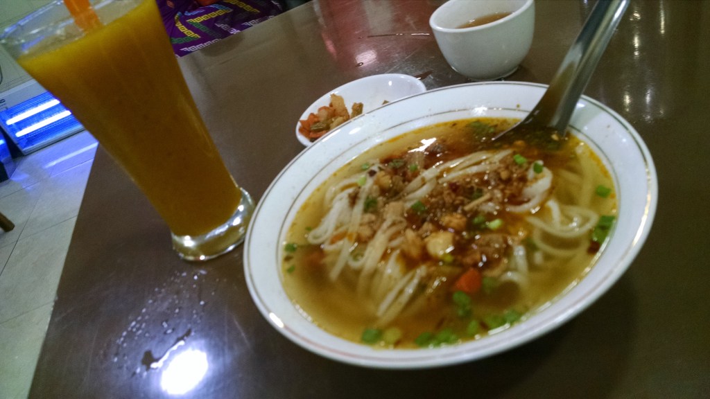 Numbers bear great significance in Myanmar, as noted by the Irrawaddy magazine. Hence, nationwide cease-fire negotiations in 2015—the year of my three-month residence in Thailand and brief excursion to Yangon—began at 9 a.m. on September 9, among nine government representatives and nine ethnic leaders. Nine, or konawin (၉), is viewed as auspicious, so much so that there is more than one 999 noodle shop in the Burmese capital. This particular noodle shack, 999 Shan Noodle Shop (၉၉၉ ရှမ်းခေါက်ဆွဲ), gave sanctuary from the unceasing foot and motorcycle traffic. I had buckled more than once from the swelter, both downtown and at Shwedagon Pagoda. But strong broth, tropical-fruit drinks, and the faith of the Buddhist multitude will often bring renewal.
